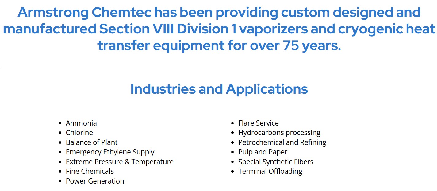 Armstrong Chemtec has been providing custom designed and manufactured Section VIII Division 1 vaporizers and cryogenic heat transfer equipment for over 75 years.